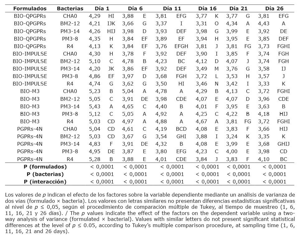 La generación de los bioformulados define valores significativos al proceso de multiplicación de rizobacterias, viabilidad celular y sus interacciones (p < 0,001) en los días (1, 6, 11, 16, 21 y 26). En cuanto a la viabilidad celular al día 1, los bioformulados BIO-QPGPRs, BIO-M3 y PGPRs-4N alcanzaron la concentración celular de CHA0 con 7,87E+11, 6,63E+9 y 4,80E+8 UFC/mL, respectivamente. La disponibilidad de los nutrientes del bioformulado BIO-IMPULSE mantuvo la viabilidad celular en las rizobacterias (R4 y PM3-8), con 1,05E+10 UFC/mL. Esto indica que el alto contenido de UFC/mL está relacionado con la alta disponibilidad de los nutrientes, que mejora la actividad biológica del bioformulado (Cuadro 5).
