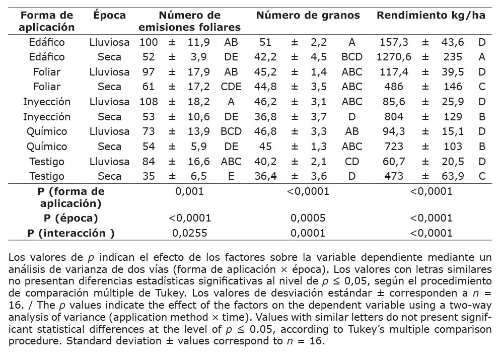 En el cultivo de cacao, la aplicación por inyección en la época lluviosa incrementó el número de emisiones foliares (108), mientras que la aplicación edáfica en la misma época aumentó el número de granos (51). En época seca, el rendimiento del peso seco del cacao (1270 kg/ha) mejoró cuando las aplicaciones de los formulados se realizaron de forma edáfica. Además, en la temporada seca, se presentó una disminución total de Phytophthora (0 %) por el efecto de las aplicaciones por inyección.