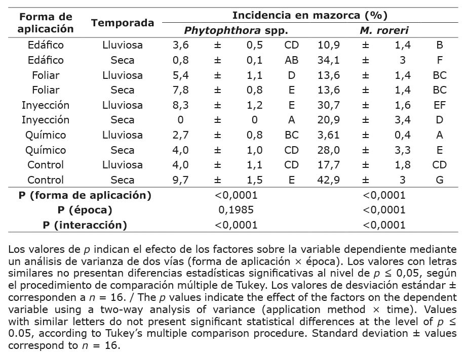La proliferación de M. roreri en mazorcas de cacao disminuyó con la aplicación del bioformulado BIOQ-PGPRs a nivel foliar, con niveles de infección del 13,6 % para sus dos temporadas, actuó sobre la mazorca de cacao. La aplicación edáfica del bioformulado PGPRs en temporada seca se incrementó un 34 % de infección en mazorca de CCN-51 (Cuadro 8). Estos resultados sugieren que la efectividad de las diferentes formas de aplicación para el control de Phytophthora spp. y M. roreri puede variar según la temporada del año.