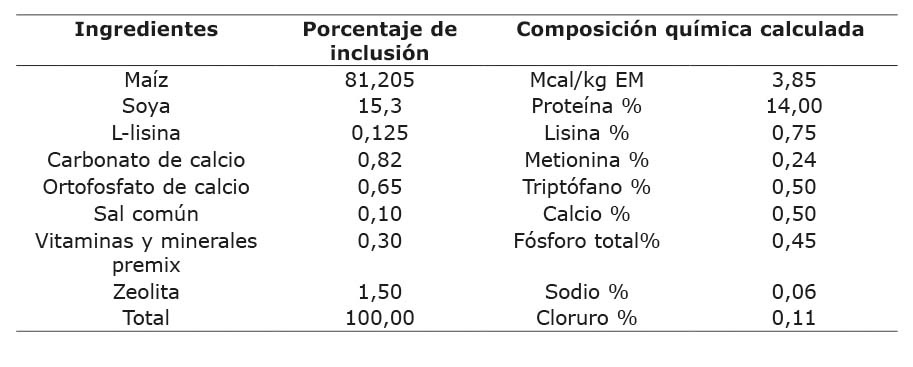Table 1. Ingredients and calculated chemical composition of experimental diets (dry matter) used in York-Landrace breed pigs. Xalisco, Nayarit, México. 2019.