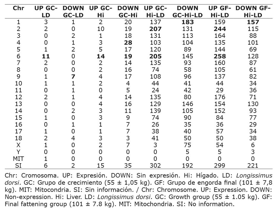 En el cromosoma 6, al comparar la expresión genética diferencial entre los tejidos hígado y L. dorsi, se observó que en ambos grupos (GC y GF) existió el mayor número de genes con expresión (205 y 258, respectivamente). En el cromosoma 2, ocurrió algo similar a lo descrito en el cromosoma 6. En cuanto al cromosoma 1, la mayor cantidad de genes con expresión genética diferencial baja se encontró en el tejido hígado, tanto en el GC como en el GF, con 183 y 157 genes, respectivamente (Cuadro 4).
