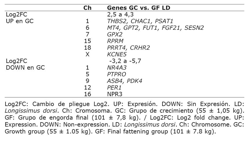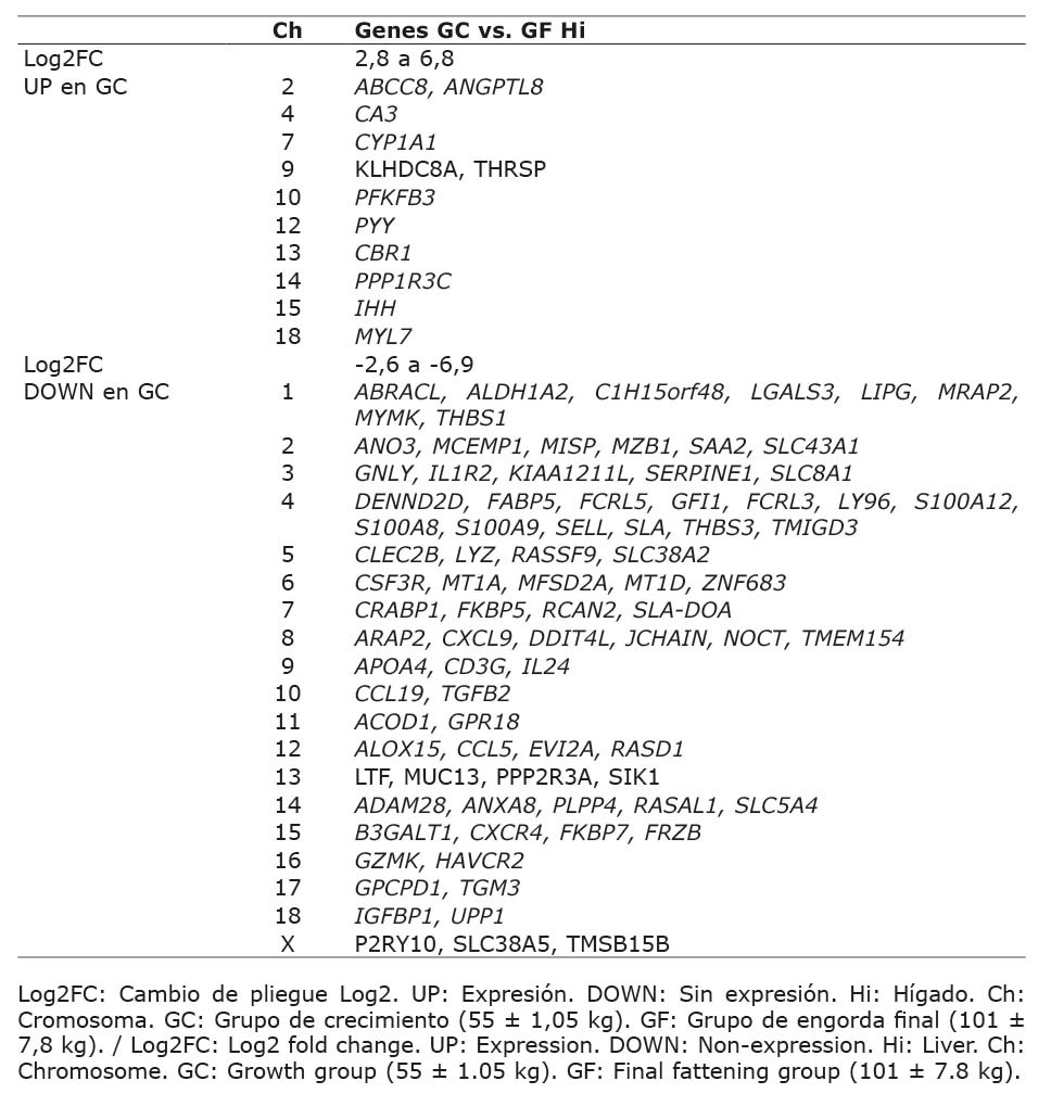 Los genes con expresión genética diferencial extrema y mayores cambios de pliegue Log2 en L. dorsi e hígado se presentan en el Cuadro 5. Se identificaron con expresión los genes FUT1, SESN2 y FGF21 en el GC. También se identificaron genes con expresión en el mismo grupo (GC) relacionados con detoxificación (GPX2, MT4 y SESN2). En el grupo de crecimiento, se identificaron los genes NR4A3, PDK4, PER1 y PTPRO, los cuales están involucrados en funciones biológicas como procesos del sistema inmune y ritmo circadiano. Sin embargo, en los cerdos del GC no se identificaron genes con expresión que pudieran estar involucrados con las siguientes funciones biológicas: respuesta al estrés, sistema inmune, locomoción, regulación de lipoproteínas, ritmo circadiano, comportamiento y detoxificación. Los genes IHH y MYL7 fueron los más involucrados en funciones biológicas con expresión en el GC frente al GF.