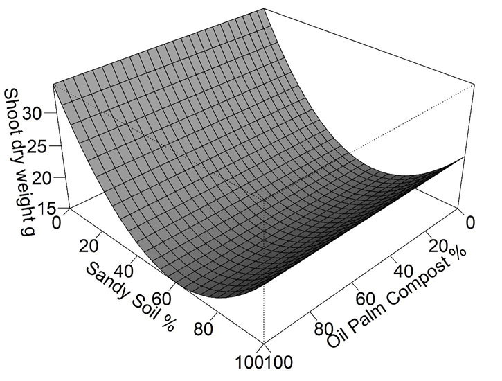 These results indicate that the mixture of compost with sandy soil promoted better growth in cacao seedlings, which is a positive outcome, as sandy soils are readily available for cacao producers in these regions; likewise, the presence of fruit bunch residues of oil palm for nursery in greenhouse conditions. Since similar results between independent variables were obtained, but only SDw indicated an interaction between the factors studied, this variable will be discussed in this research. For this purpose, a response surface was constructed and presented in Figure 1.