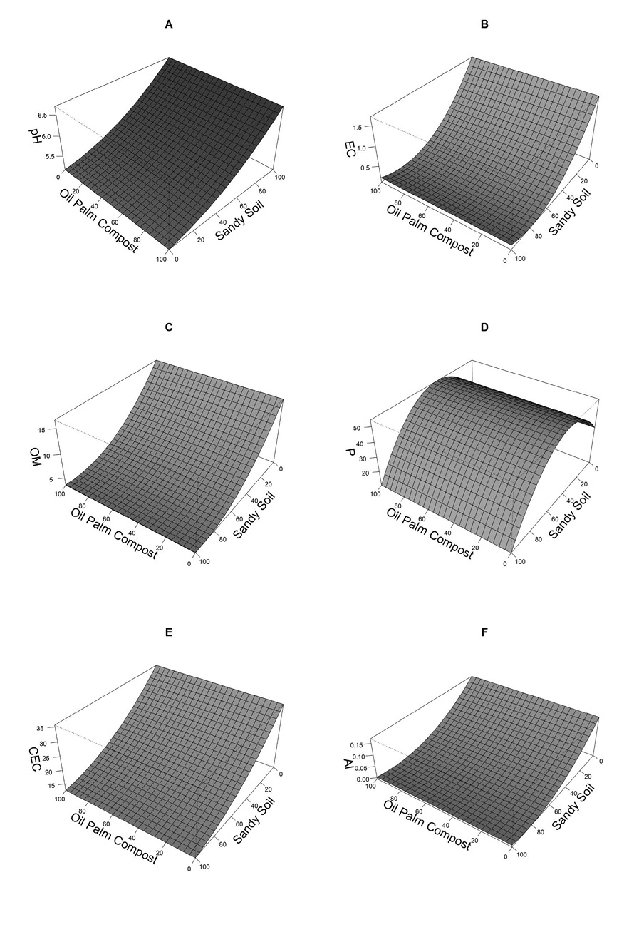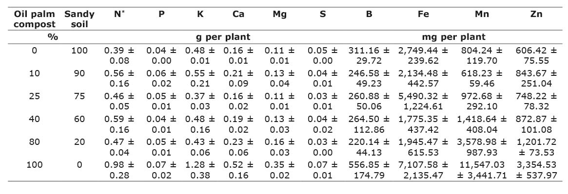 In general, the higher accumulation of biomass was observed with the higher dose of oil palm compost (Figure 1), with no indication of toxicity even when the seedlings were directly grown in 100 % compost. However, the lowest growth was recorded at 60 % of sandy soil and 40 % of oil palm compost; this may be related to low input of nutrients. Also, higher macroporosity and high drainage in the soil may have restricted water nutrition in plants, especially in high temperature days.