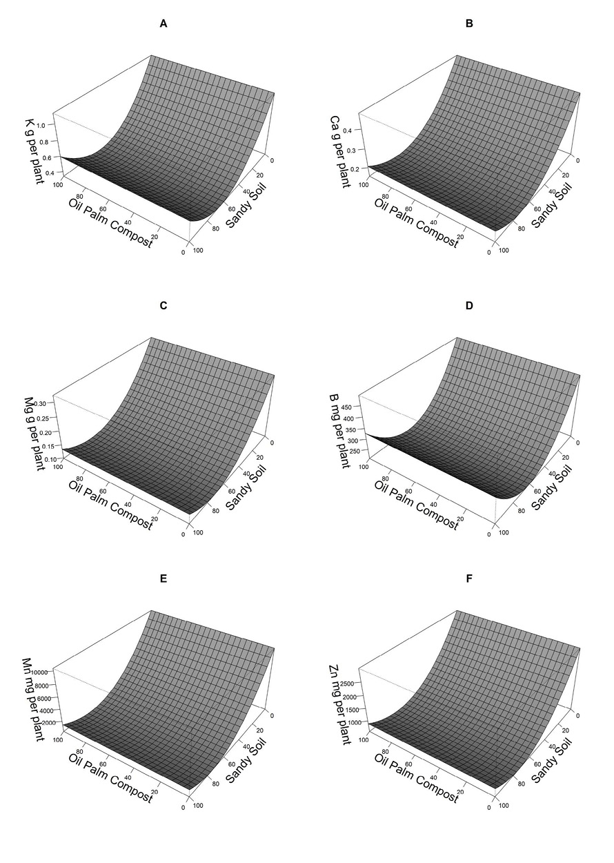 Figura 3. Efecto de la interacción de las dosisde compost de palma aceitera y suelo arenoso en el contenido de nutrientes: potasio – K (3A), calcio - Ca (3B), magnesio - Mg (3C) en g por planta y boro - B (3D), manganeso - Mn (3E) y cinc - Zn (3F) en mg por planta en plántulas de cacao en condiciones de vivero. Yurimaguas, Perú, 2022.