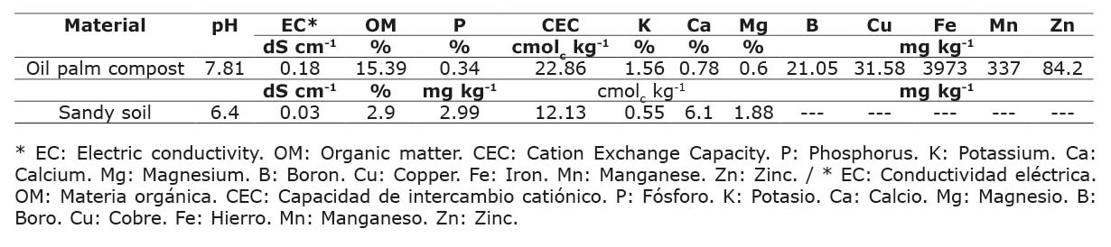 The plant material was obtained from Instituto de Cultivos Tropicales nursery, using synthetic seeds that guaranteed the genetic quality of the clone CCN-51. The seeds were previously pre-germinated in sawdust for three days before being transplanted into the final pot with the application of Parachupadera® (Flutolanil + Captan), to avoid fungal diseases. For the sandy soil, the material was collected from the upper layer (0-20 cm) of fluvent soil. As for the oil palm compost, only the harvest residues (bunch) were used and composted for three months to achieve the correct size and characteristics for the experiment. The analysis of the soil and the oil palm compost is presented in Table 1. Substrates used were maintained at field capacity to avoid drought stress in cacao plants.