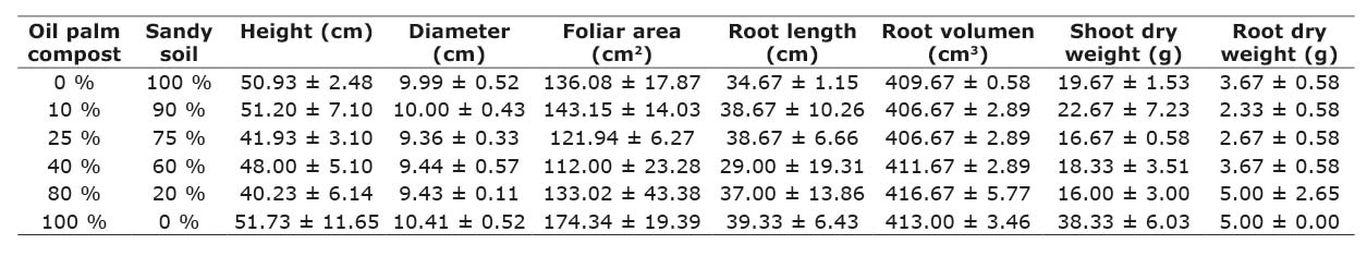 At the end of the experiment, to evaluate the combination of the sandy soil and the oil palm compost, in each repetition, biometric variables were measured according to Arévalo-Hernández et al. (2022). Height (cm) was measured with a ruler, diameter (mm) with a vernier scale, and leaf area (cm2) with a portable leaf area meter (YMJ-B Luzeren®). Also, plants were sacrificed, and the shoot and root were collected and dried at 60 ºC in a stove. The dry weight (g) of both the shoot and root was then recorded in all treatments with each repetition using a calibrated balance.