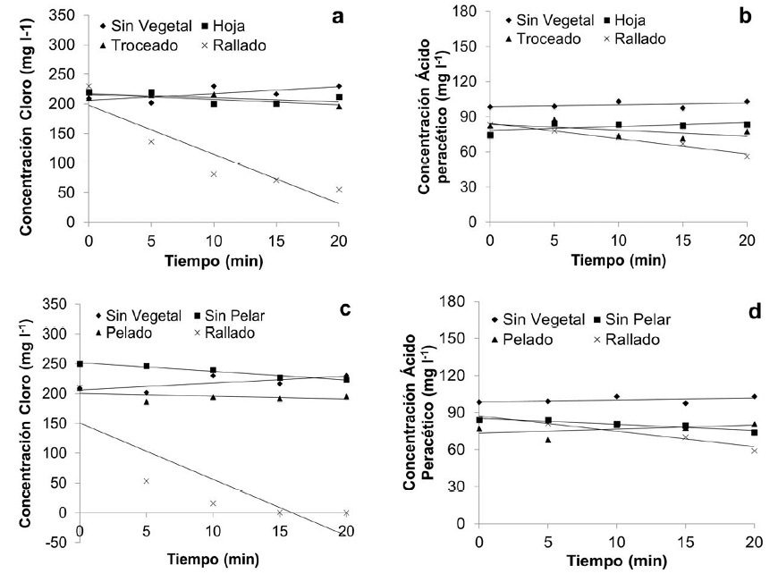 Un comportamiento similar de la concentración de ambos desinfectantes se obtuvo con el plátano verde (Figuras 1c y 1d). Para ambos desinfectantes el plátano rallado causó la mayor reducción en su concentración durante 20 min (p<0,0001), mientras que las otras presentaciones (sin vegetal, sin pelar y pelado) se mantuvieron constantes en un valor de 200 mg l-1 para el cloro y 80 mg l-1 para el ácido peracético. Además, se determinó que la disminución del cloro cuando se desinfectó plátano verde rallado, fue más acelerada que cuando se utilizó repollo rallado (p<0,0001) (Figuras 1a y 1c). Por último, para ambos vegetales rallados, la concentración de cloro disminuyó más rápido y a valores más bajos en comparación con el ácido peracético (p<0,0001) (Figuras 1a, 1b, 1c y 1d).