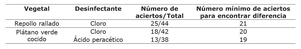 Table 2. Number of correct responses by a trained panel of judges who performed the triangle difference test, according to the analyzed vegetable and desinfectant used. San José, Costa Rica, 2012.