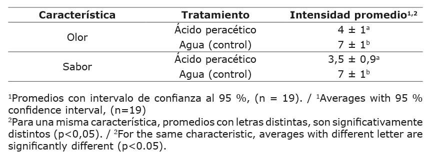 En cuanto al análisis sensorial, los jueces entrenados encontraron diferencias sensoriales entre las muestras de repollo tratadas con agua y las tratadas con cloro (p<0,05) (Cuadro 2). No se encontraron diferencias (p>0,05) entre muestras de plátano verde cocido desinfectadas con cloro o ácido peracético, al compararlas con muestras inmersas en agua. La desinfección de repollo rallado con ácido peracético produjo cambios evidentes en el color (oscurecimiento) y textura en el producto, por lo que no se aplicaron las pruebas de diferencia a dicha muestra. Las pruebas de intensidad en el olor y el sabor del repollo rallado (Cuadro 3), demostraron que la intensidad del olor a repollo disminuye al usar ácido peracético (p=0,0008), lo cual también sucede con la intensidad del sabor (p=0,0001).