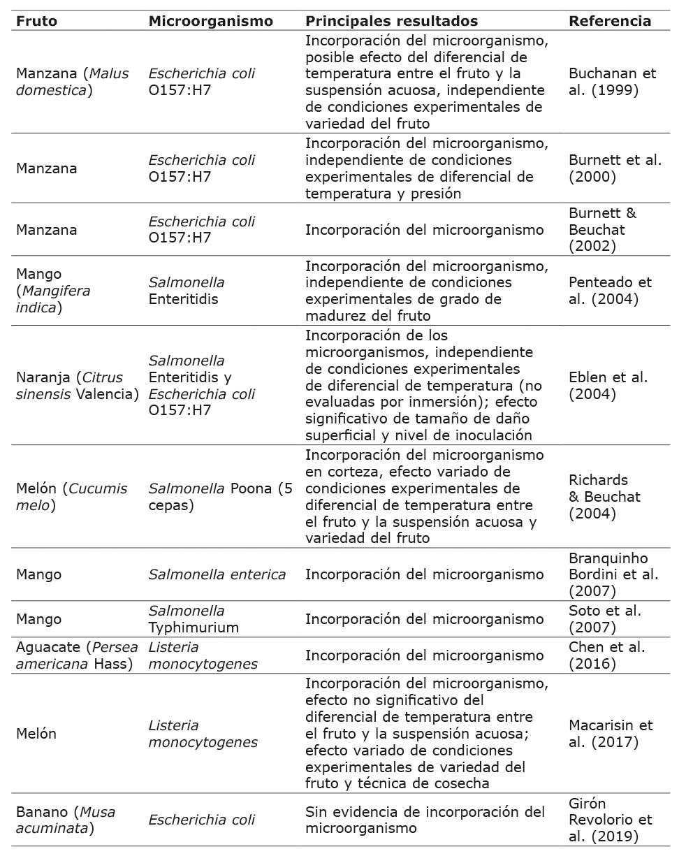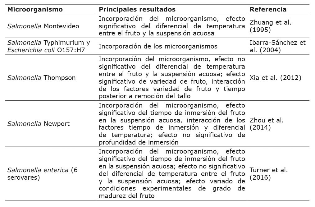 La incorporación de microorganismos en frutos se ha analizado desde el año 1977, cuando Segall et al. (1977) estudiaron el efecto de la temperatura del agua de los tanques de lavado en el deterioro del tomate (Solanum lycopersicum), producto en el cual ha sido estudiado este fenómeno con mayor frecuencia. Los principales resultados con respecto a incorporación de microorganismos en tomate se muestran en el Cuadro 1.