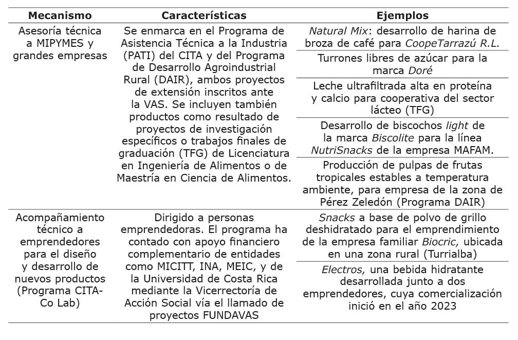 Estas asesorías han permitido la transferencia del conocimiento hacia la industria alimentaria para el desarrollo de nuevos productos e implementación de nuevas tecnologías, así como para la mejora de formulaciones o procesos ya existentes en las empresas. Algunos casos exitosos de vinculación del CITA con el sector agroalimentario costarricense se ejemplifican en el Cuadro 1, donde se muestran las distintas formas para lograr la transferencia de conocimiento. Las asesorías técnicas constituyen una modalidad creada, en el año 1984, dentro del marco del Programa Pati (Centro Nacional de Ciencia y Tecnología de Alimentos [CITA], s.f.) y, en el 2020, inició el Programa CITA Co-Lab que tiene por objetivo brindar acompañamiento técnico a personas emprendedoras para el diseño y desarrollo de nuevos productos (O’Neal Coto, 2020).