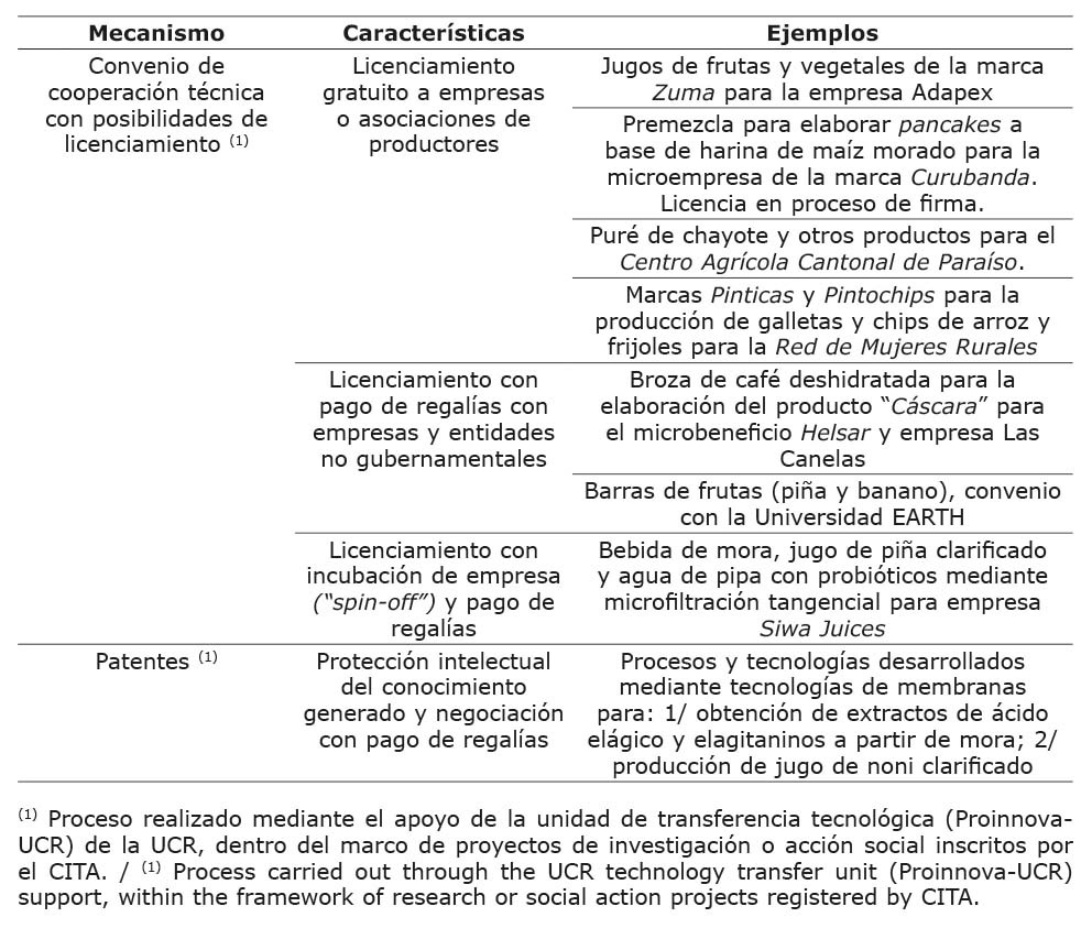Un mecanismo que ha puesto en práctica el CITA para la transferencia de conocimiento hacia el sector productivo costarricense ha sido mediante la firma de convenios de cooperación técnica con posibilidades de licenciamiento, de los cuales se resumen algunos casos en el Cuadro 2. Dichos convenios se han suscrito con el apoyo de Proinnova, la Unidad de Gestión y Transferencia del Conocimiento para la Innovación de la Vicerrectoría de Investigación de la UCR. Para el licenciamiento ha sido fundamental proteger la propiedad intelectual y preservar la confidencialidad de la información, bajo una modalidad de secreto industrial, o bien a través del registro de patentes.
