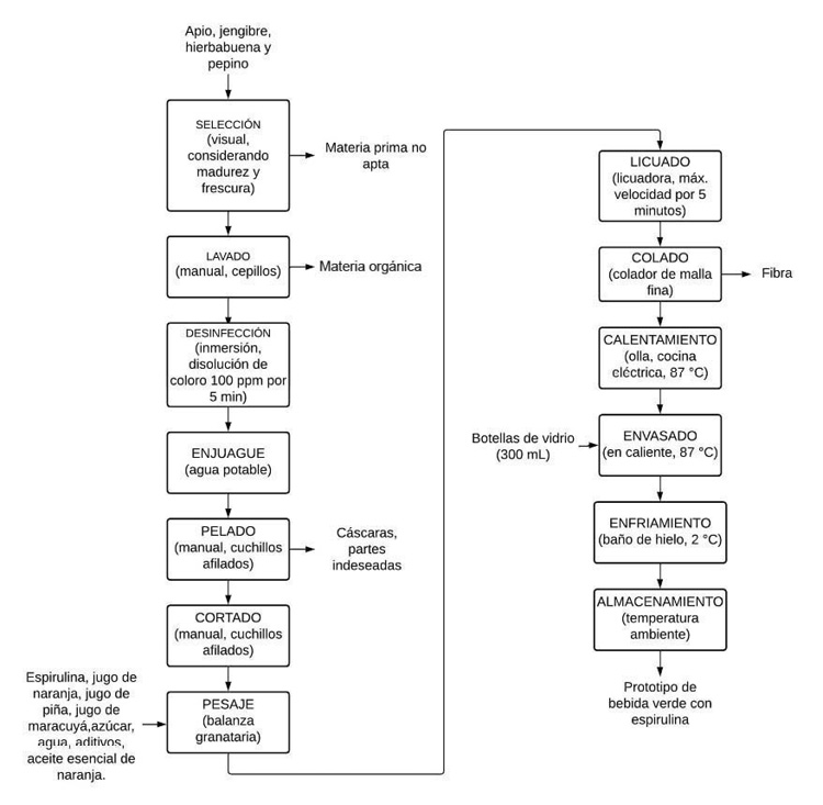 Se utilizó espirulina (Arthrospira sp.) en polvo de la marca Sun is Shining. Se utilizaron jugos de piña (13,1 °Brix, pH 3,68), de maracuyá (14,3 °Brix, pH 2,90), de naranja (10,9 °Brix, pH 3,81) y el aceite esencial de naranja. Los vegetales apio, pepino, hierbabuena y jengibre se adquirieron frescos de un proveedor local. Los aditivos carboximetilcelulosa (CMC), ácido cítrico y ácido ascórbico utilizados fueron de grado alimentario. Se utilizó azúcar cruda no refinada.