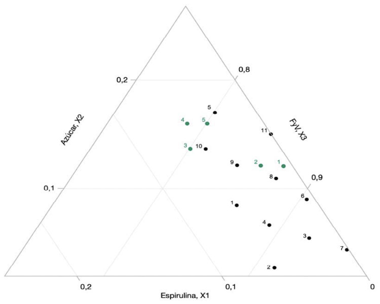Se utilizó un diseño experimental de mezclas del tipo llenado del espacio (space filling design) con espirulina, azúcar y frutas/vegetales como factores y agrado general como variable respuesta. El diseño se obtuvo mediante el programa estadístico JMP16. Los factores evaluados fueron restringidos a un rango con un límite mínimo y uno máximo, ya que no era factible su uso en el rango de 0 % a 100 %. Las once mezclas de la bebida utilizadas en el diseño experimental y las cinco formulaciones usadas para la verificación del modelo matemático se muestran en la Figura 2.