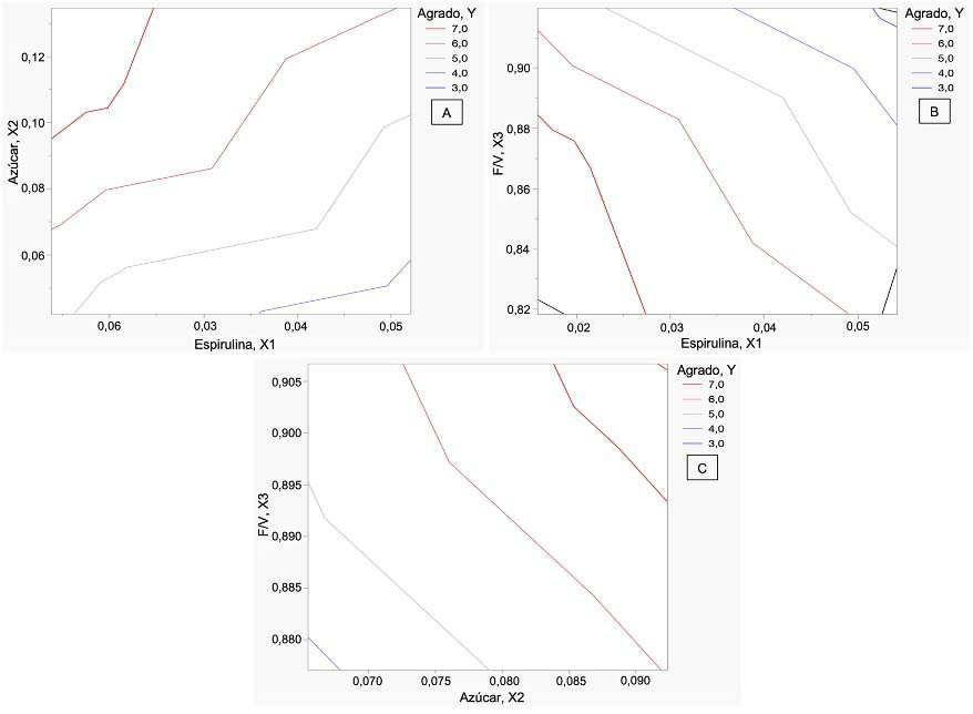 Figure 3. Contour diagrams of the behavior between sugar and spirulina (Arthrospira sp.) (A), fruits and vegetables and spirulina (B) and fruits and vegetables and sugar (C) obtained after the evaluation of eleven prototypes of green drinks with spirulina in a sensory panel with 95 consumers. Guanacaste campus, Universidad de Costa Rica, Liberia, Costa Rica, 2022.
