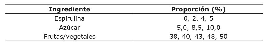 Se prepararon doce prototipos de bebida a partir de la formulación base. Se varió la proporción de frutas/vegetales (5 niveles), azúcar (3 niveles) y espirulina (4 niveles) los niveles se muestran en el Cuadro 1. Los ingredientes evaluados (espirulina, azúcar y frutas/vegetales) fueron los que mostraron mayor efecto en las características sensoriales del producto. El ingrediente frutas/vegetales se elaboró con jugo de piña, jugo de naranja, apio, pepino, jengibre, jugo de maracuyá y hierbabuena, siempre en la misma proporción. El agua, estabilizante, antioxidante y regulador de la acidez mantuvieron fija su cantidad en todas las formulaciones.