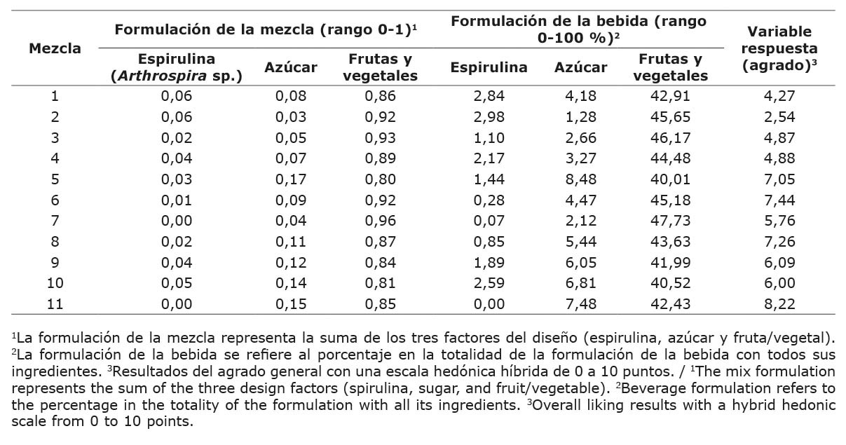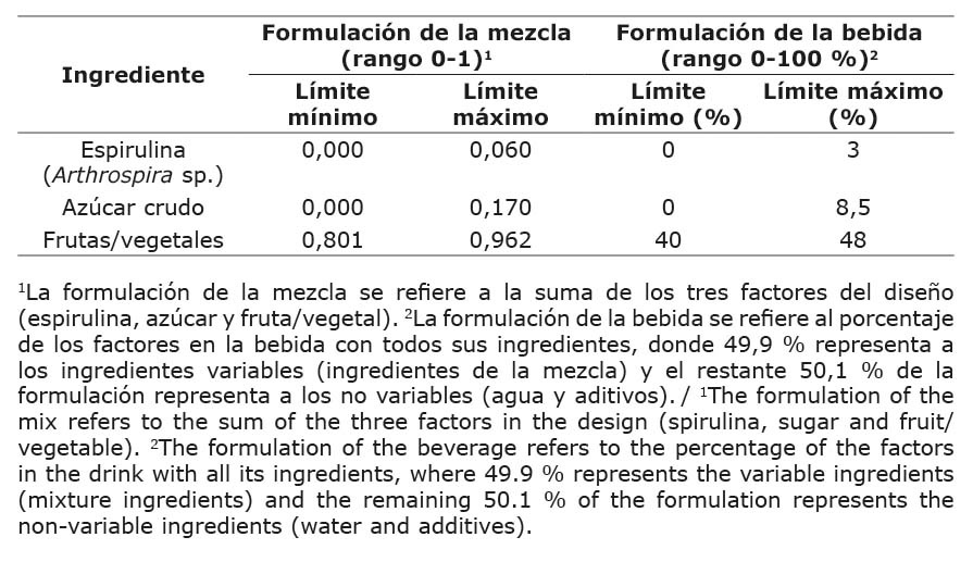 Los rangos máximos y mínimos de los factores estudiados se presentan en el Cuadro 2 para la formulación de la mezcla y de la bebida. La formulación de la mezcla se compone de los ingredientes que fueron factores de estudio: espirulina, azúcar y frutas/vegetales, y la suma de estos corresponde siempre a 1,0. La formulación de la bebida corresponde a la totalidad de ingredientes, lo que incluyó aditivos y agua y se refiere al 100 % de los ingredientes en la formulación.
