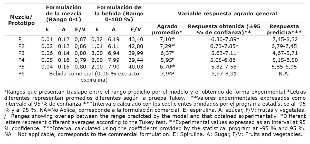 Se realizó con un panel de veintisiete personas, quienes evaluaron cinco mezclas distintas y una muestra comercial. Los valores experimentales obtenidos se solaparon con los predichos por el modelo matemático con un 95 % de confianza (Cuadro 4). Esto confirmó que el modelo fue capaz de predecir el agrado de manera precisa.