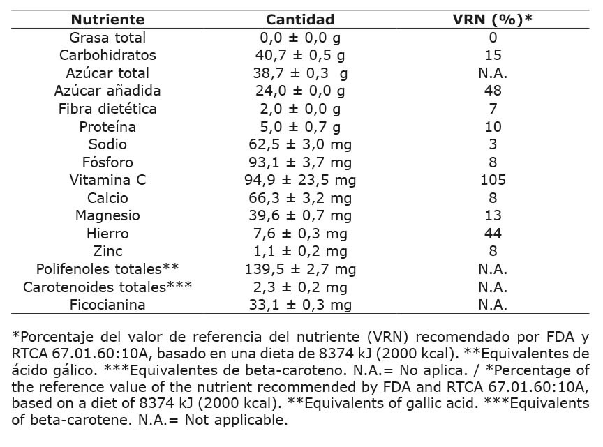 Destaca el valor nutricional obtenido en la bebida para vitamina C y hierro, ya que la porción aporta el 105 % y 44 % del VRN, para estos dos micronutrientes esenciales. El contenido de vitamina C mejora el sistema inmunológico y está asociado con las frutas y vegetales utilizados en la formulación (Martí et al., 2009). El contenido de hierro obtenido es aportado a la bebida por la espirulina. La espirulina se destaca como un ingrediente rico en hierro, con una concentración de 28,5 mg de hierro en 100 gramos de espirulina (Marlina & Nurhayati, 2020).