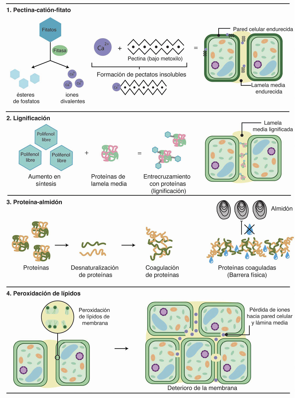 Se han descrito cambios bioquímicos que pueden contribuir con la impermeabilidad y el oscurecimiento de los granos endurecidos, como la formación de complejos de proteínas-taninos (Parmar et al., 2017; Stanley, 1992). Una investigación reciente, evaluó con microscopía por autoflorescencia e inmuno-marcaje de epitopos pécticos, las paredes celulares de frijoles frescos y almacenados por tres meses (Chen et al., 2021). Ellos encontraron que los frijoles almacenados bajo condiciones desfavorables presentaban una pared celular con mayor dureza y cantidad de entrecruzamiento de pectina con iones de calcio. Además, establecieron que la pectina también formaba enlaces con polifenoles, como el ácido ferúlico. Ambos se encontraban acumulados en zonas de unión intercelulares, lo que apoya la hipótesis de pectina-catión-fitato y la de polifenoles.