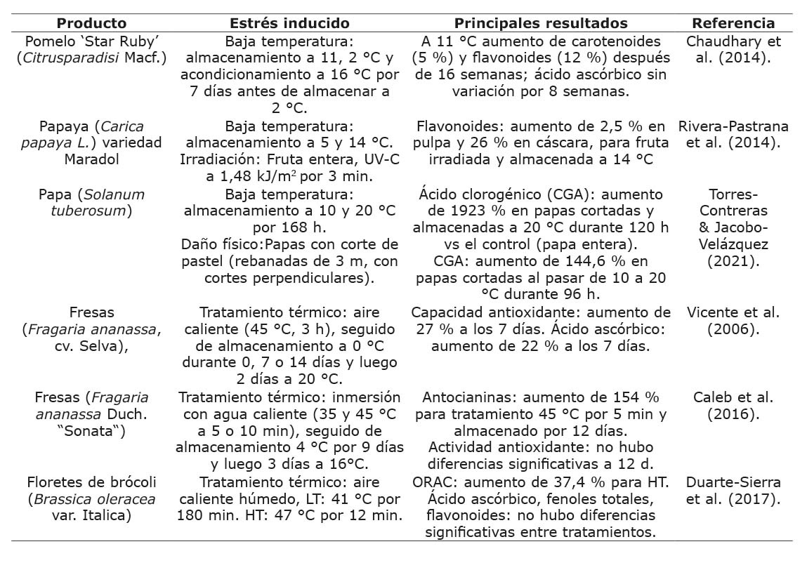 La información disponible sobre investigaciones relacionadas con los efectos del estrés abiótico inducido en frutas y vegetales en la fase de postcosecha, mediante la aplicación de tratamientos de daño físico, temperatura alta o baja, aplicación de sustancias químicas e irradiación, da evidencia de un efecto en la acumulación de compuestos bioactivos. Los compuestos acumulados y la magnitud del aumento observado después de la aplicación de los tratamientos que inducen estrés abiótico, seguidos de almacenamiento con duración y condiciones diferentes, presentaron grandes variaciones. Los efectos generados dependieron de la naturaleza del producto, el grado de desarrollo, la composición inicial, el tipo de tratamiento y su intensidad, y las condiciones del almacenamiento posterior.