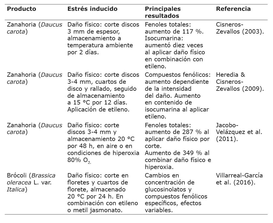 Al someter papa a diferentes intensidades de daño físico por corte, y almacenarla a 10 °C por 4 días, se observó un incremento de hasta 100 % en el contenido de compuestos fenólicos en papa rebanada. En tratamientos de daño físico más intensos, con mayor disminución de tamaño, se observó menor acumulación, e incluso disminución en el contenido de compuestos fenólicos, con presencia de isómeros de ácido clorogénico. A diferentes intensidades de daño físico y tiempo de almacenamiento, se detectó predominancia de diferentes isómeros, ácido clorogénico, ácido neo-clorogénico y ácido cripto-clorogénico (Torres-Contreras et al., 2014). La aplicación de daño físico a brócoli, reducido a floretes y cuartos de florete, y almacenado por 24 h a 20 °C, tuvo como resultado cambios en la concentración de glucosinolatos y compuestos fenólicos específicos. Los efectos fueron variables y dependieron del nivel de daño y la combinación con la aplicación de fitohormonas. Los floretes de brócoli almacenados en aire mostraron una concentración aumentada de ácido 3-O-cafeolquínico, entre otros (Villarreal-García et al., 2016).