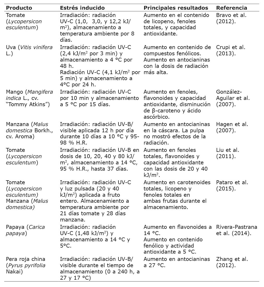 El someter papaya verde madura a radiación UV-C (1,48 kJ/m2) y almacenarla a 14 °C incrementó (p < 0,05) el contenido de flavonoides en piel y pulpa. La radiación y el almacenamiento en frío (5 °C) incrementaron el contenido fenólico y la actividad enzimática antioxidante como una respuesta defensiva ante el estrés oxidativo (Rivera-Pastrana et al., 2014). En uva globo roja (Vitis vinifera L.) la aplicación de radiación UV-C triplicó el contenido de algunos compuestos fenólicos al aplicar 2,4 kJ/m2 (3 min) y almacenar a 4 °C por 48 h, e incrementó el contenido de antocianinas con el uso de 4,1 kJ/m2 (5 min) luego de 24 h a esa misma temperatura (Crupi et al., 2013).
