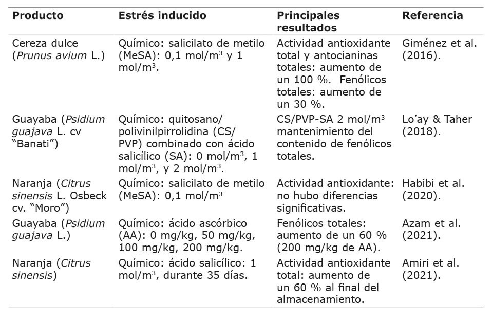La diversidad de estudios consultados muestra que la aplicación de sustancias químicas impacta el contenido de compuestos bioactivos. En las cerezas tratadas con MeSA, la actividad antioxidante total aumentó a lo largo del almacenamiento con concentraciones finales de un 100 % más. En las antocianinas totales, los niveles en cosecha aumentaron tanto en las cerezas control como en las tratadas en un 100 % más. Los niveles de fenólicos totales fueron un 30 % mayores en las cerezas tratadas con MeSA que en los controles (Giménez et al., 2016). El contenido fenólico total fue mayor en un 60 % en los frutos de guayaba tratados con 200 mg/kg de AA que en los frutos de control (Azam et al., 2021).