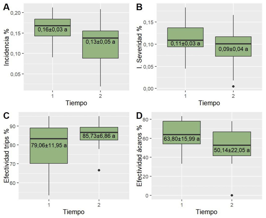 El factor tiempo no mostró diferencias estadísticas, tanto la incidencia como la severidad de Botrytis mantuvieron valores estadísticamente iguales en el primer y segundo tiempo de evaluación. La efectividad en el control de trips y el control de ácaros también se mantuvieron estadísticamente igual en ambos tiempos (Figura 1).