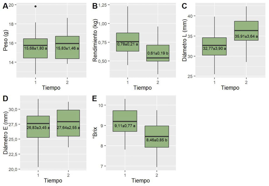 A) Peso fresco (g) del fruto. B) Rendimiento en kg. C) Diámetro longitudinal del fruto. D) Diámetro ecuatorial del fruto. E) Grados Brix de la fruta.