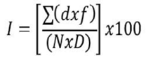 [1] Donde, d es la categoría de severidad en la fruta, y f es la frecuencia con que ocurre esa la categoría de severidad, N es el número total de frutas examinadas y D la categoría más alta de severidad que ocurrió en la escala.