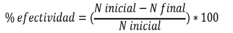 La efectividad en el control de trips se estimó mediante el conteo de los insectos presentes en todas las flores de la unidad experimental, al sacudir sobre una hoja de papel bond al inicio y final de los tiempos de evaluación. La efectividad del control de ácaros se evaluó por conteo de individuos en dos hojas al azar de cada planta al inicio y final de los tiempos de evaluación, con un estereomicroscopio Nikon Smz445. En ambos casos, la eficiencia se calculó por medio de la ecuación 2, descrita por García et al. (2012), donde N es el número de individuos total.