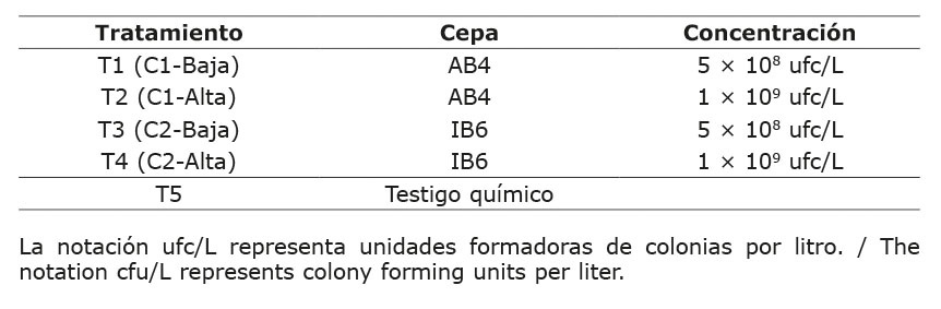 Cada cepa masificada en el biopreparado sólido se evaluó a dos concentraciones: 1 × 109 UFC/L y 1 × 108 UFC/L. Estas fueron comparadas con el testigo químico que consistió en la rotación que usa el productor de la finca, captan 50W (3 g/L) y clorotalonil 720 (2 mL/L) como fungicidas, y abamectina 18 EC (0,75 mL/L) y lambdacialotrina 25 CS (0,3 mL/L) como insecticidas (Cuadro 1). Todos los tratamientos se mezclaron con fijador agrícola nonylphenol ethoxylated (0,5 mL/L) y el fertilizante foliar metalosato multimineral-Albion (0,5 mL/L). La aplicación de los tratamientos se hizo mediante bomba de mochila calibrada.