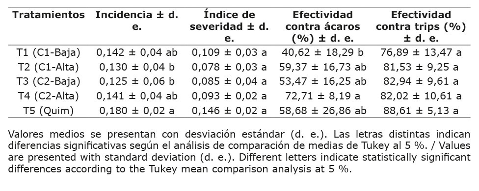 La efectividad contra trips fue similar entre los tratamientos biológicos y el tratamiento testigo químico, mientras que la efectividad contra ácaros fue mayor en el tratamiento T4 (C2-Alta), que corresponde a la cepa IB6, en comparación con el testigo químico.