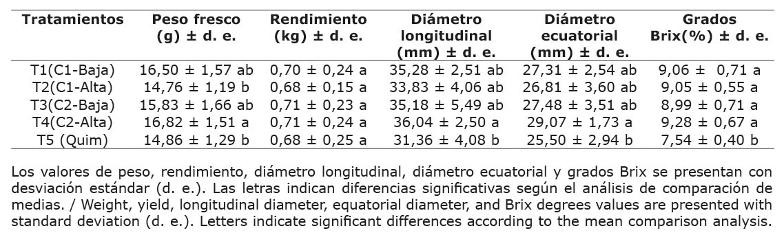 Las variables de interés agronómico, como el peso fresco de frutos, los diámetros y los grados Brix, mostraron diferencias significativas, con valores superiores a los encontrados en el tratamiento testigo químico.