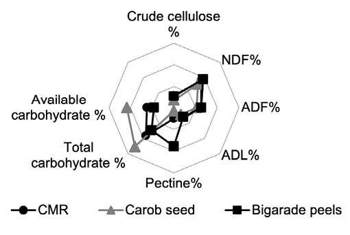 The by-products examined displayed moderate to low levels of neutral detergent fiber, acid detergent fiber and acid detergent lignin. Higher neutral detergent fiber percentages correlate with reduced dry matter consumption, while increased acid detergent fiber levels correlate with decreased forage digestibility (Arelovich et al., 2008). Consequently, Bigarade peels and carob residue represent valuable additions to animal diets.
