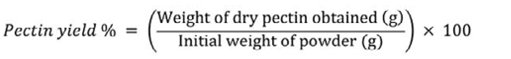 Pectin was determined according to Hasem et al. (2019). 100 g of sample were stirred into a 900 mL hydrochloric acid aqueous solution adjusted to the desired pH of 2.5. Subsequently, the solutions were extracted at 85 °C for 60 minutes. The slurries were filtered through cheesecloth and allowed to cool to room temperature at 25 °C. Acidified ethanol, comprising 4 % hydrochloric acid added to 95 % ethanol in the ratio of 1:4 (v/v), was then incubated for 60 minutes at 25 °C. The mixture underwent centrifugation at medium speed for 15 minutes using a benchtop centrifuge (Kubota 5100, Fujioka, Japan). Afterward, the solutions were rewashed twice with 95 % ethanol (1:2, v/v) and centrifuged for 15 minutes. The precipitate was collected and dried in a hot-air oven until a constant weight was achieved. The percentage of pectin yield collected was calculated using the equation 5.