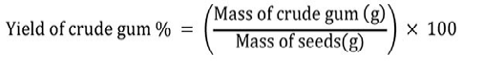 (5) The extraction of the gums was conducted following the protocol outlined by Lagha-Benamrouche et al. (2023). 100 g of seeds were macerated in a 60 ml H2SO4/H2O solution with a ratio of 60/40 v/v at 60 °C for 1 hour. This acid treatment at an elevated temperature carbonized the hull, which was subsequently removed through extensive washing and rubbing in water, and passing through a metallic sieve with a 2 mm mesh size. The dehusked seeds were then dried at 100 °C for 30 minutes and briefly crushed (10 seeds dehusked/3s) using a laboratory mill (model MF 10, IKA, Staufen, Germany) to separate the two endosperms (albumen) and release the germ, which detached in pieces due to its friability. The germ fractions were sifted off from the unbroken endosperm halves using a 2 mm sieve. The pieces of endosperm were then ground and sifted with a 0.125 mm sieve to produce flour, resulting from the acid dehulling pre-treatment. The yield was determined using the following equation 6.