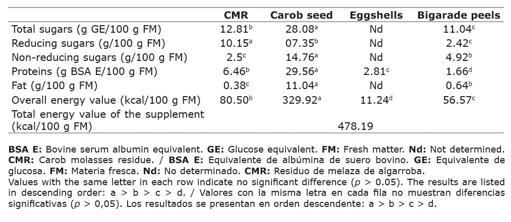 Cuadro 1. Contenido en compuestos químicos y valor energético estimado de los subproductos estudiados (residuos de melazas de algarroba y semillas de algarroba (Ceratonia siliqua L. cv. Bouzegza), cáscaras de huevo y cáscaras de naranja amarga (Citrus aurantium L. cv. Bigarade)) recogidos en Boumerdés, Argelia, 2021.