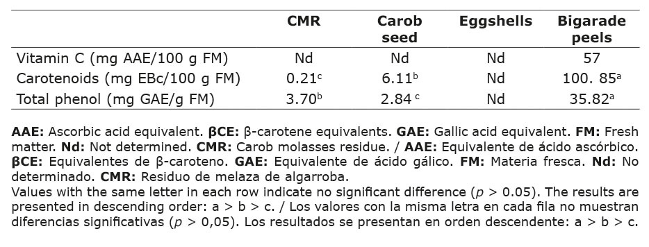 Cuadro 3. Contenido en vitamina C, carotenoides y polifenoles de los subproductos estudiados (residuos de melazas de algarroba y semillas de algarroba (Ceratonia siliqua L. cv. Bouzegza), cáscaras de huevo y cáscaras de naranja amarga (Citrus aurantium L. cv. Bigarade)) recogidos en Boumerdès, Argelia, 2021.