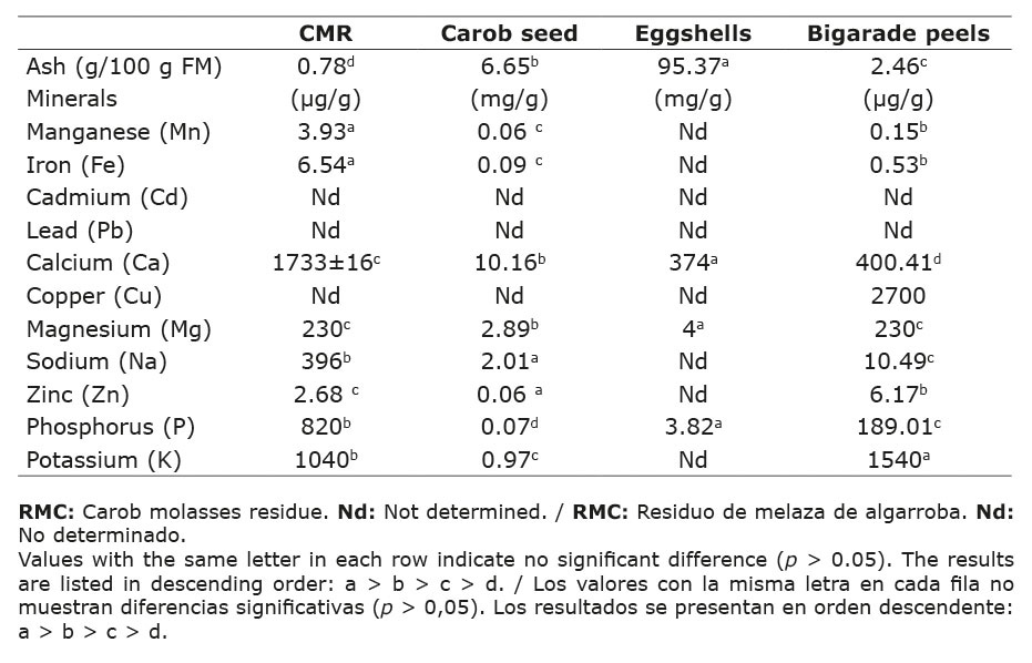Cuadro 2. Contenido en cenizas y minerales de los subproductos estudiados (residuos de melazas de algarroba y semillas de algarroba (Ceratonia siliqua L. cv. Bouzegza), cáscaras de huevo y cáscaras de naranja amarga (Citrus aurantium L. cv. Bigarade)) recogidos en Boumerdés, Argelia, 2021.