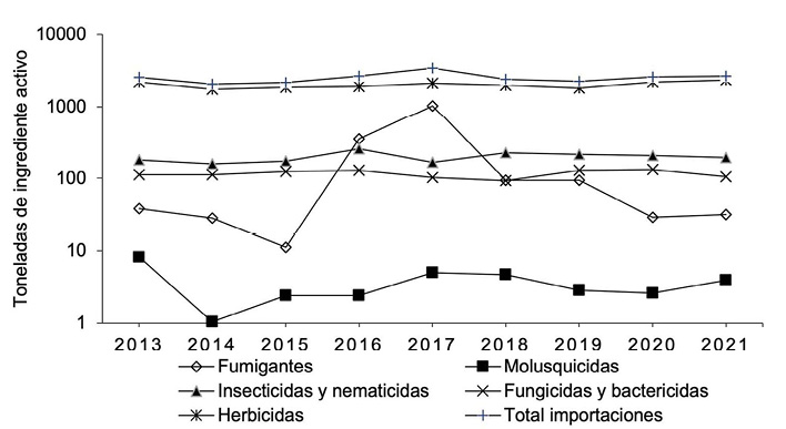 El volumen global de importaciones de plaguicidas osciló entre 2055 t en el año 2014 y 3413 en 2017. Se observó un leve incremento de 115 t en el volumen importado en 2021 respecto a 2013. Del total global, los herbicidas representaron un mínimo de 61,7 % en 2017 y un máximo de 87,4 % en 2021. El volumen promedio anual de herbicidas importados durante el periodo fue de 2021,4 t. En segundo lugar, se encontraron los fumigantes con un promedio de 189,6 t, pero con una variación anual amplia de 11 t en 2015, y 1032 t en 2017, año en que incrementaron significativamente por importaciones específicas de bromuro de metilo.