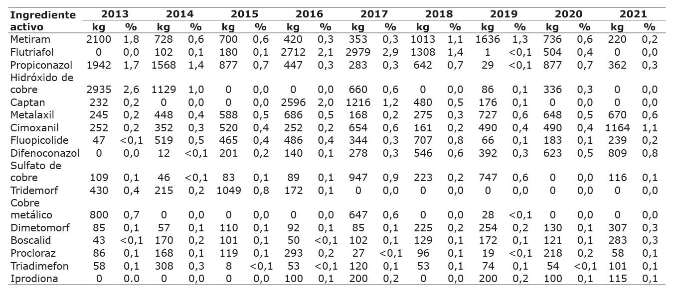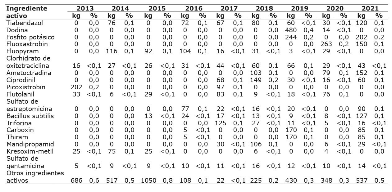 Se encontró un número de i.a. que decreció en al menos 50 % durante el mismo periodo. Los i.a. que disminuyeron fueron: captan (-100 %), triadimenol (-100 %), hidróxido de cobre (-100 %), cobre metálico (-100 %), tridemorf (-100 %), metiram (-90 %), epoxiconazol (-86 %), trifloxistrobin (-83 %), propiconazol (-81 %), ciproconazol (-74 %) y oxicloruro de cobre (-51 %). El resto tuvieron menores variaciones, la importacion fue irregular o en volúmenes menores durante el periodo (Cuadro 9).