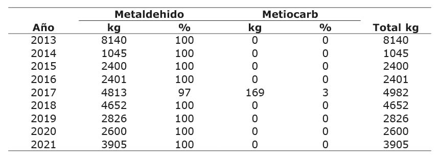 Durante el periodo estudiado se importaron dos i.a. correspondientes a esta categoría. El volumen de metaldehído equivalió al 99,5 % de las importaciones totales, mientras que las de metiocarb al 0,005 %. En promedio se importaron cada año 3,64 t de metaldehído, mientras que metiocarb solo fue importado en 2017. Las importaciones de metaldehído tuvieron notable variación anual (Cuadro 10).