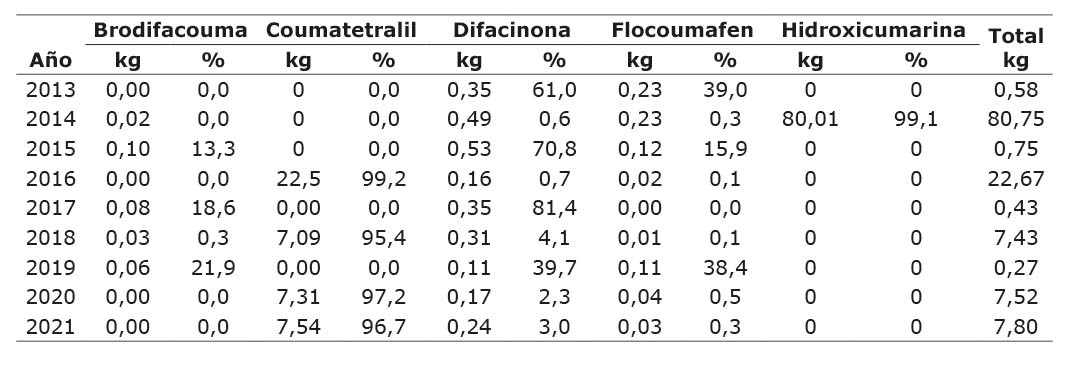 Se importaron cinco i.a. correspodientes a esta categoría. En términos de volumen, la importación de hidroxicumarina en 2014 equivalió al 62,4 % del volumen de todos los rodenticidas importados. El segundo i.a fue coumatetralil con 34,7 %, mientras que el tercero fue difacinona con 2,1 %. Las importaciones de flocoumafen y brodifacouma se realizaron en volúmenes más bajos. La tendencia general de importación reveló decrecimiento para algunos i.a. como brodifacouma que no se importó durante los años 2020 y 2021, mientras que flocoumafen disminuyó 89 % en el 2021 respecto al 2013. En contraste, las importaciones de coumatetralil y difacinona tuvieron notable variación anual (Cuadro 11).