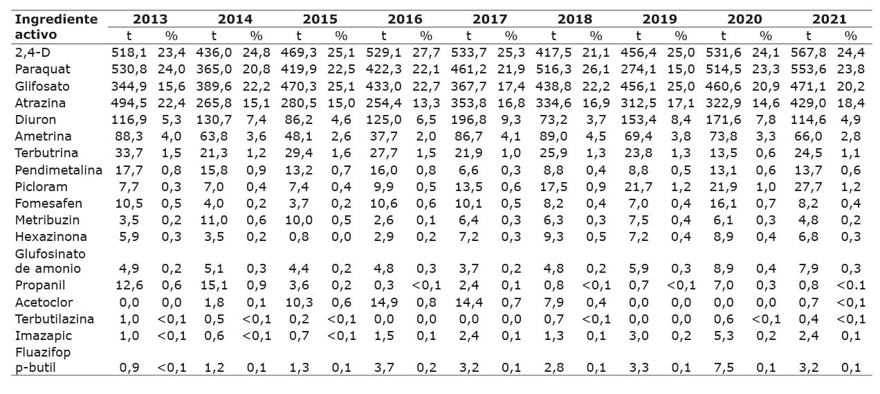 Table 1. Annual volume (in metric tons of a.i. - active ingredient) of the main herbicides, and percentage of the total annual imported volume of all herbicides, during the period from January 1, 2013, to December 31, 2021.