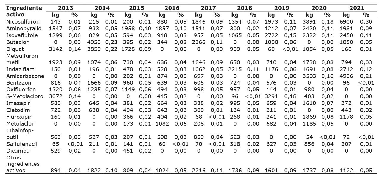 Se observaron tendencias marcadas al incremento o a la disminución del volumen importado en ciertos i.a. Los que incrementaron de forma gradual en al menos 50 % en 2021 respecto a 2013 fueron: nicosulfuron (4720 %), indaziflam (1708 %), fluroxipir (635 %), saflufenacil (371 %), picloram (260 %), fluazipop-p-butil (258 %), imazapic (136 %), isoxaflutole (89 %) y glufosinato de amonio (60 %). La importación de glifosato, el tercer ingrediente activo más importado incrementó 37 %. En contraste, los que disminuyeron de forma gradual en al menos 50 % o más fueron: dicamba (-100 %), clomazone (-100 %), ciprosulfamida (-100 %), bispiribac de sodio (-100 %), oxifluorfen (-100 %), diquat (-95 %), propanil (-93 %), fenoxaprop-p etil (-91 %), bentazon (-88 %) y cihalofop-butil (-87 %). El resto de i.a. tuvieron cambios menos acentuados, o se importaron en menores volúmenes durante el periodo analizado (Cuadro 2).