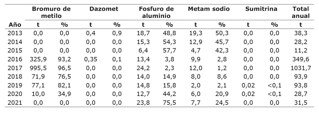 El fumigante más importado fue el bromuro de metilo, con un volumen de importación de 86,7 % del total de todos los fumigantes y desinfectantes de suelo. Sin embargo, las importaciones solo ocurrieron entre los años 2016 y 2019, con un máximo entre 2016 y 2017 (Cuadro 3). En segundo lugar, se ubicó fosfuro de aluminio con un promedio anual de 15,9 t importadas, que representaron el 8,4 % del total de fumigantes y desinfectantes de suelo. En tercer lugar, se ubicó metam sodio, con un promedio de importación de 9,2 t anuales. Las importaciones de metam sodio se redujeron 60 % durante el período, mientras que las de dazomet y sumitrina fueron irregulares durante el periodo y en volúmenes más bajos.