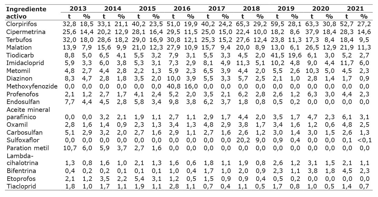 Los siguientes ingredientes activos más importados fueron cipermetrina, terbufos, y malatión, respectivamente. Cipermetrina se ubicó en segundo lugar con un promedio anual de 26,1 t (13,3 % del volumen total importado de insecticidas-nematicidas), terbufos con 25,9 t (13,2 %) y malatión con 19,5 t (9,9 %). Es importante indicar que cipermetrina solo superó a terbufos durante los años 2020 y 2021, debido a la disminución de importación de este último. El volumen combinado de clorpirifos, cipermetrina, terbufos y malatión, representó un mínimo de 42 % de las importaciones totales de insecticidas-nematicidas en 2013 y un máximo de 68 % en 2020.